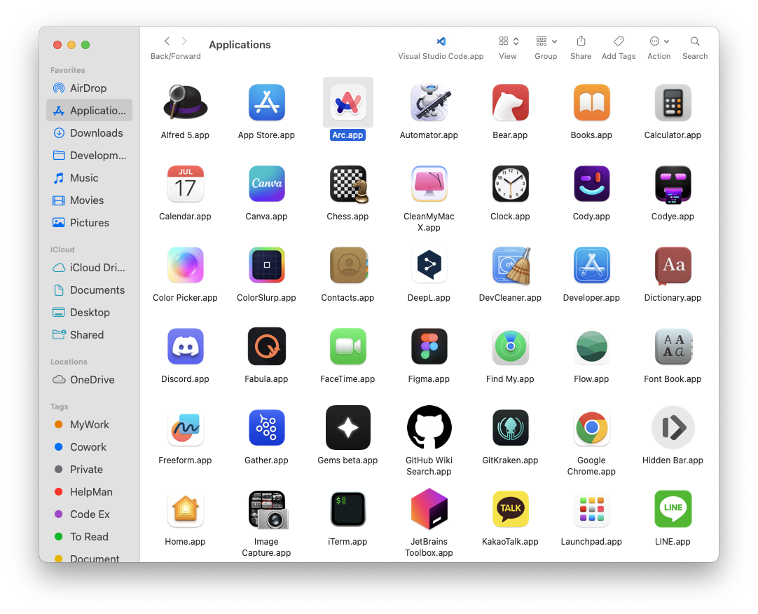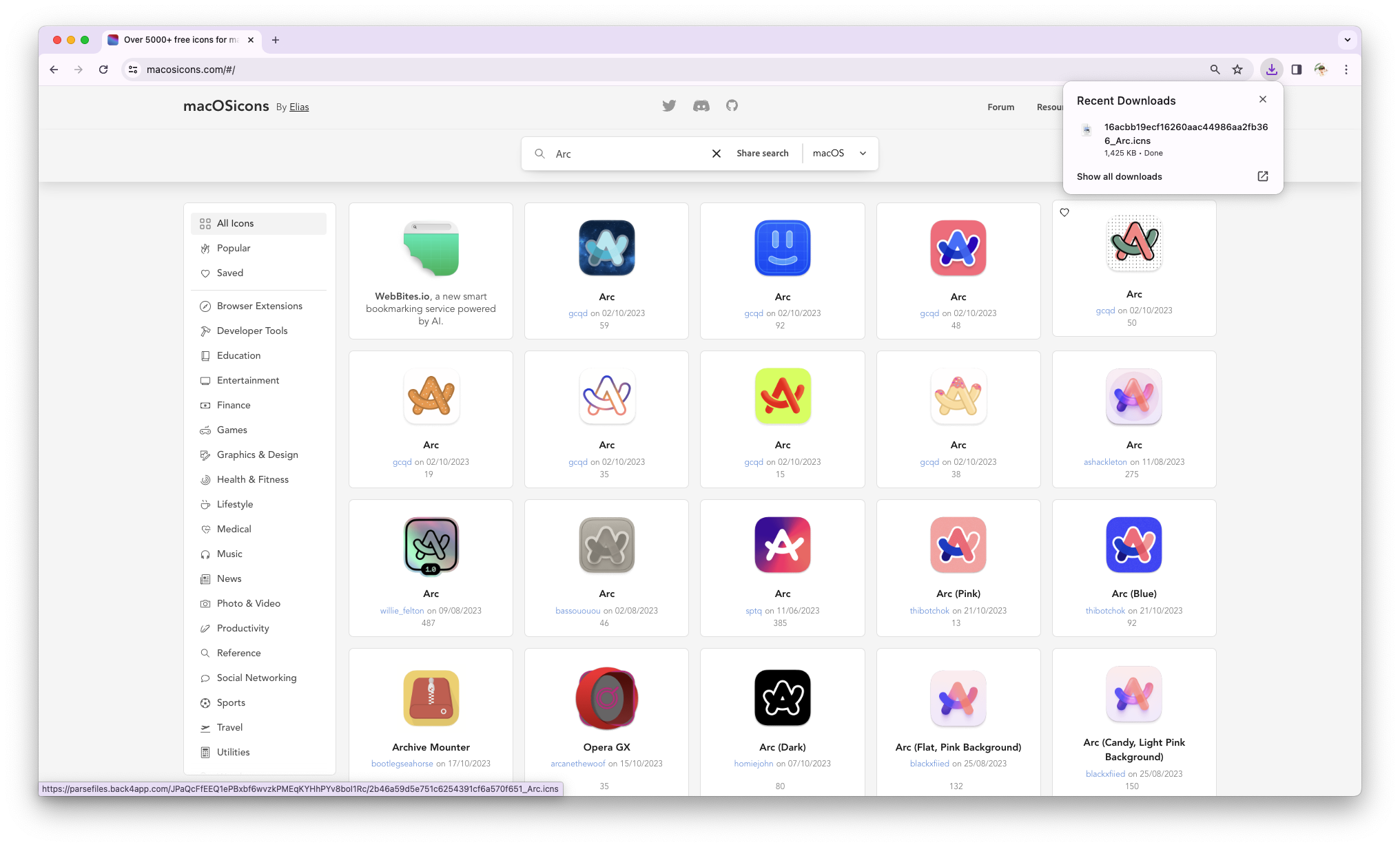 원하는 앱 또는 키워드를 검색합니다. 저는 최근에 추천받아 사용해보고 있는 Arc 브라우저를 검색해봤어요. 다양하고 귀여운 아이콘들이 많네요. 원하는 아이콘을 클릭하면 이미지처럼 바로 다운로드 됩니다.