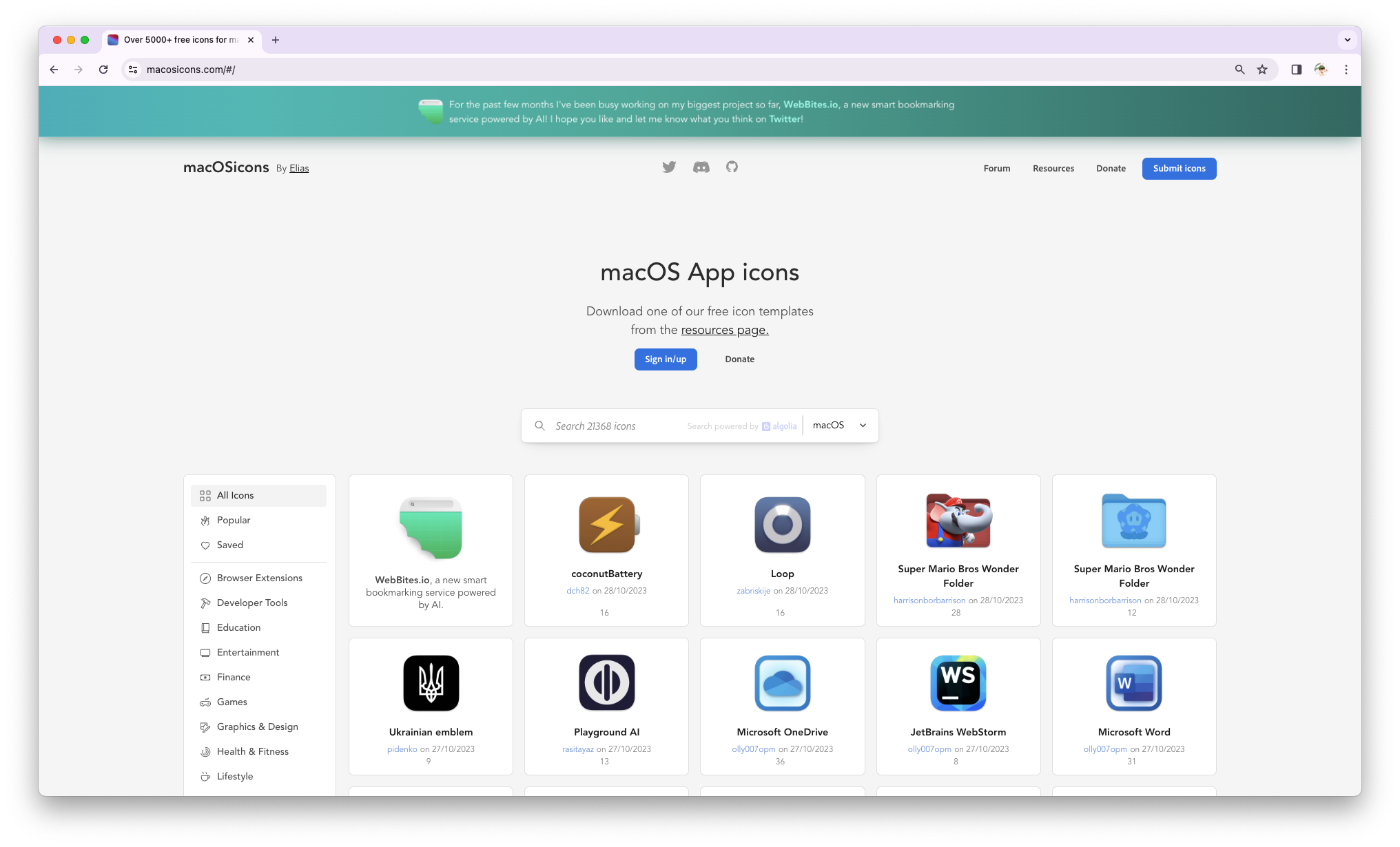 이를 위해 만들어진 사이트가 하나 있습니다! 바로 macOSicons인데요. IBM 소속의 디자이너 Elias에 의해 개발되어 오픈소스 + 비영리적으로 운영되는 사이트입니다. 포럼과 아이콘 등록 기능을 갖추고 있고, 새로운 아이콘을 만들어 올리고 싶은 디자이너/개발자들을 위해 리소스도 제공하고 있어요.