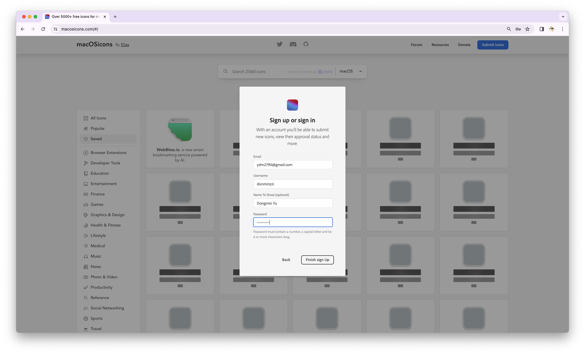 (선택) 가입 또는 로그인합니다. 필수적이지는 않지만 "Saved" 탭에 이전에 다운로드 받은 아이콘을 트랙킹해주기 때문에 해두면 좋아요.