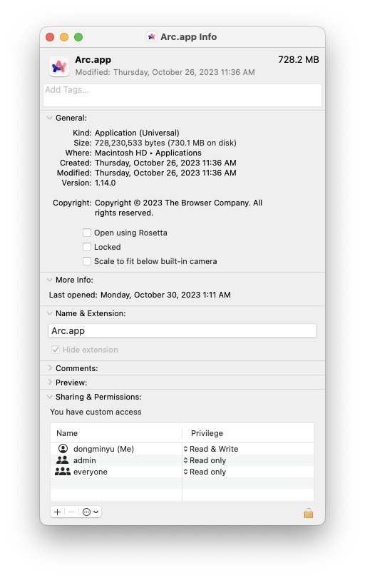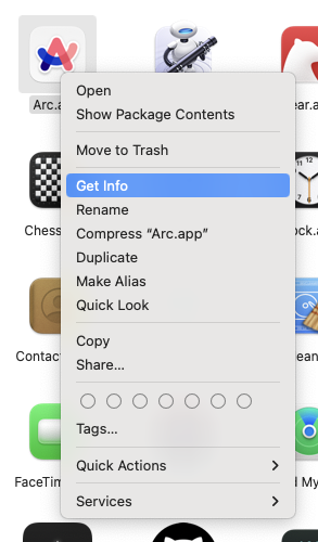 마우스 우클릭 또는 컨트롤+클릭해 컨텍스트 메뉴를 열고, Get Info 메뉴를 엽니다.