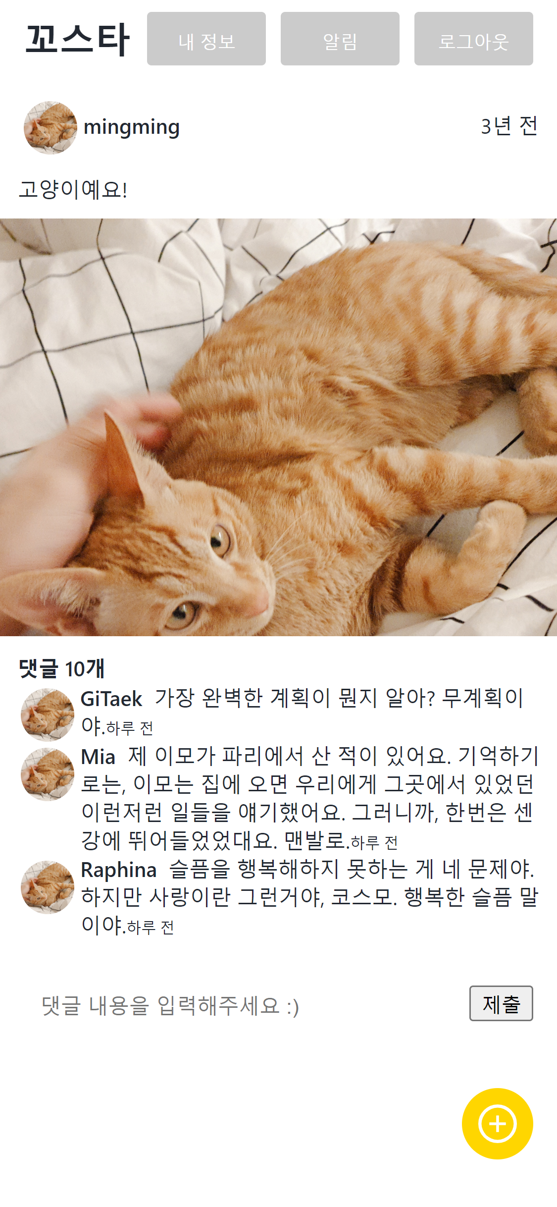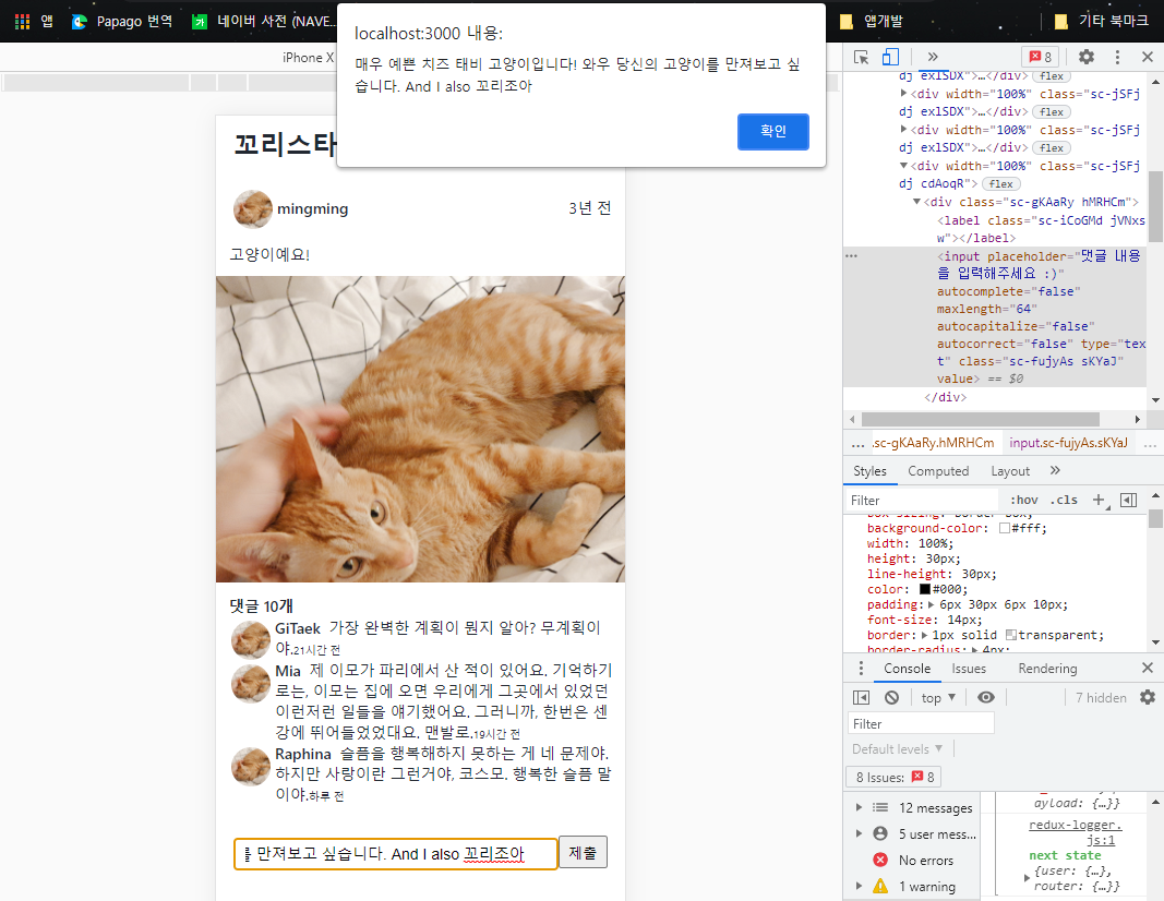 - Post의 내용을 좀 더 인스타그램스럽게 바꿔보았다. 예를 들면 스크린샷에 보이는 댓글란의 배치! 원형의 사용자 프로필 이미지는 댓글의 내용이 길어질 경우 사용자의 이름 바로 옆에 배치될 수 있도록, flex-start를 적용했고, 사용자의displayName은 댓글 내용과 같은 라인에 배치되되, 약간의 공백과 굵은 글씨로 구별이 될 수 있도록 했다. 또 moment 모듈의 locale/ko를 사용해 댓글과 게시물의 작성 시점을 'SNS스럽게' n시간 전, n일 전으로 렌더링했다.