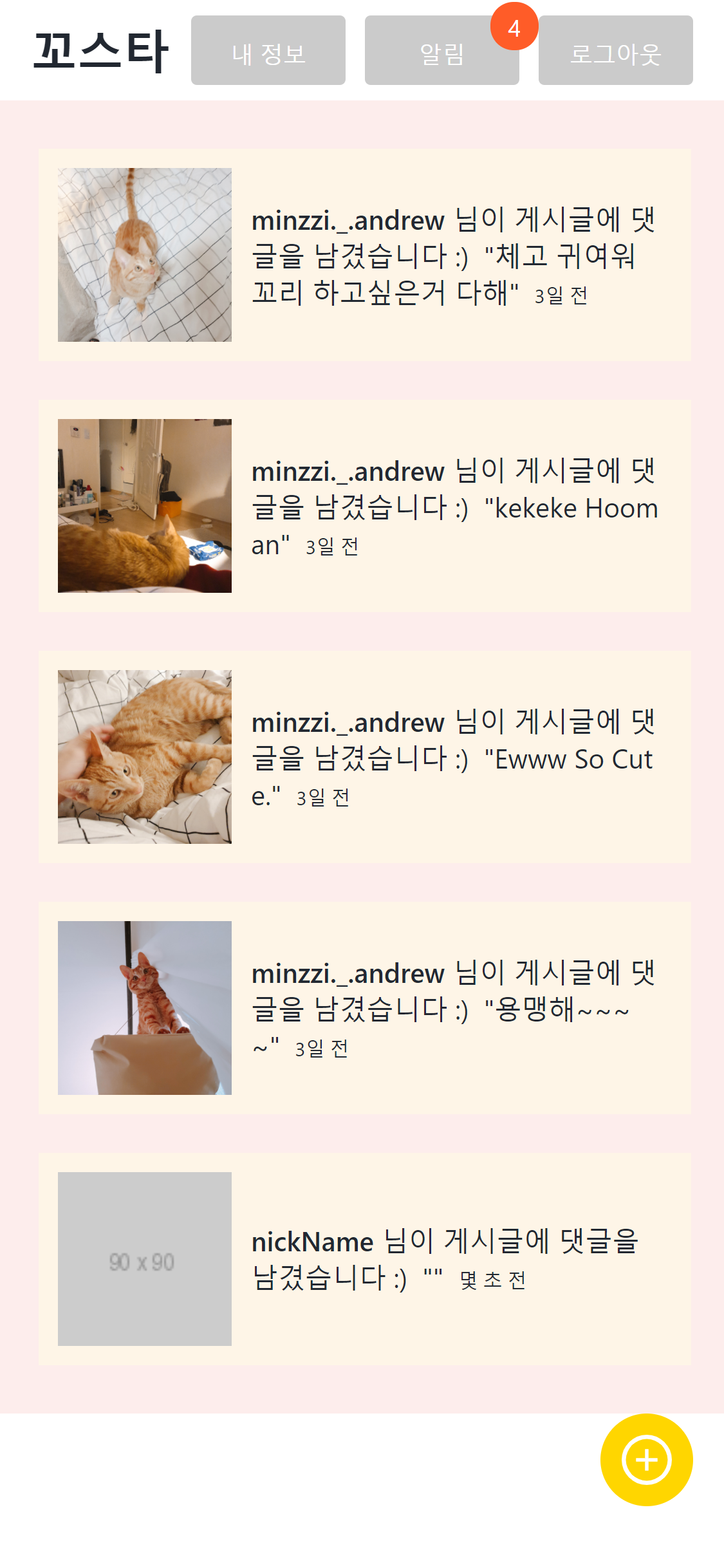 우선 알림 (Notification.js)를 만들어서, 내 게시물에 새로운 댓글이 달리거나 하면 알림이 생기고 그 개수만큼 뱃지 형태로 숫자가 디스플레이되도록 '뷰만' 구성했다. 아직 댓글 기능과 알림 기능이 제대로 구현된 상태는 아님.