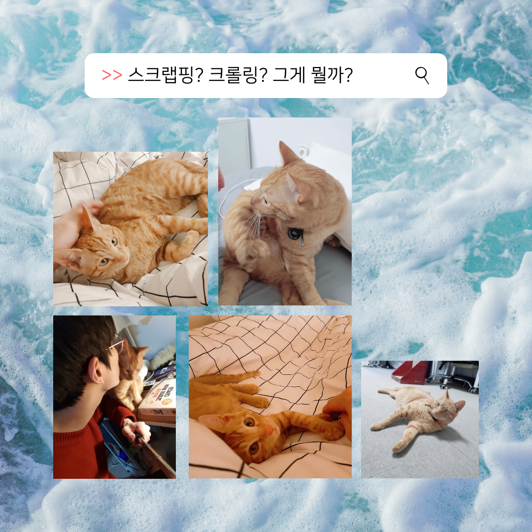 문제를 납작하게 표현하자면, 여러분이 정보를 얻기 위해 몇개의 사이트를 드나들며, 그곳의 글과 이미지 등의 정보를 스크랩하는 것이 '스크래핑', 또 그것을 컴퓨터에게 맡기는 일이 웹스크래핑이라고 할 수 있을 것이고, 여러개의 선으로 하나의 면을 만들듯이 스크래핑을 할 때 모은 하이퍼링크들을 다시 기준점으로 삼아 더 많은 사이트들을 탐구하는 파도타기 같은 작업이 웹크롤링인 것이다.