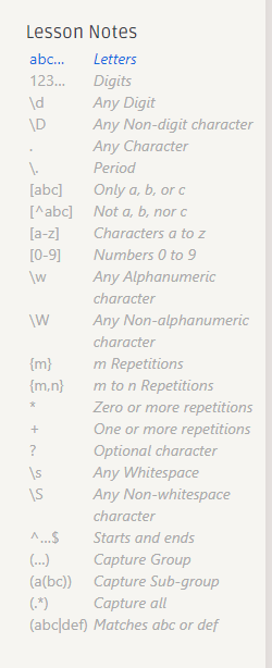 - ^ 대괄호 안에 있지 않은 ^ 기호는 문자열의 시작 부분을 나타낸다. 그러니까 해당 기호 다음에 오는 패턴과 일치하는 단어더라도, 해당 단어가 문자열의 시작 부분에 있지 않으면 매칭되지 않는다.