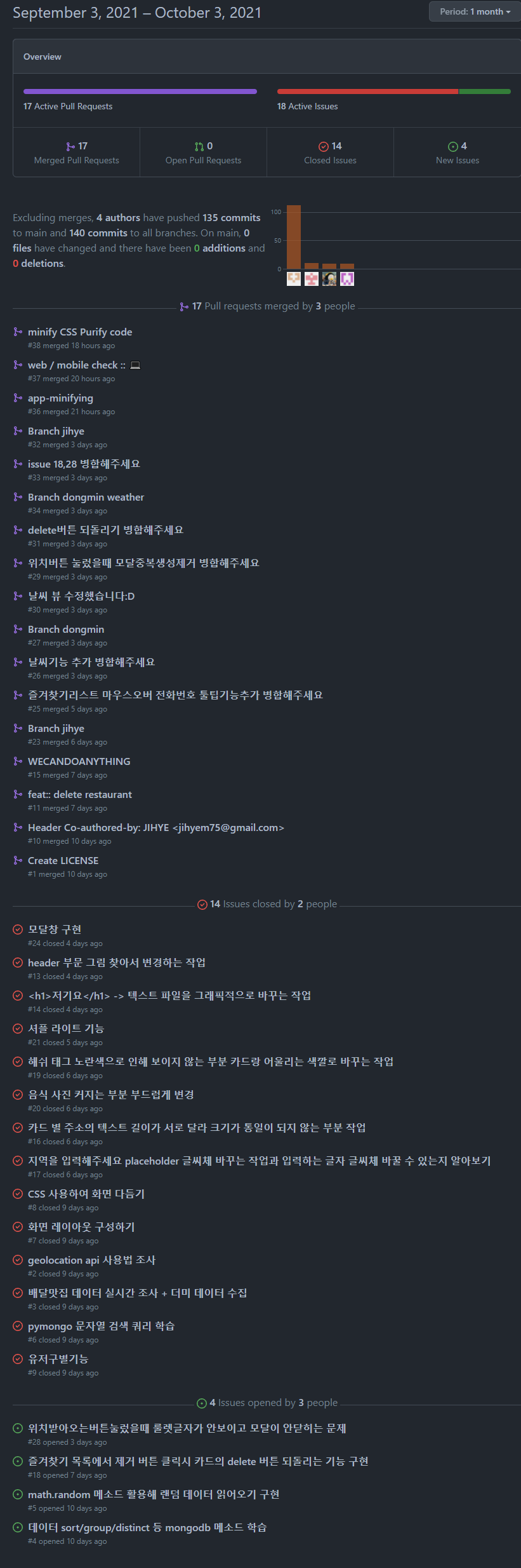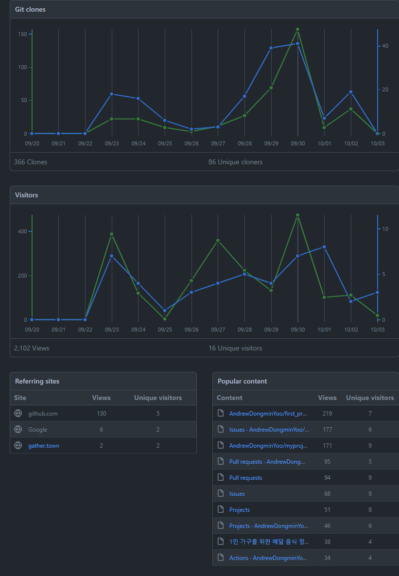 또 그 시기에 곽영호 튜터님과 깃헙 프로젝트의 '프로젝트' 탭의 중요성과 깃헙을 통한 역할 배분이 얼마나 중요하고 또 편리한 지에 대해서 듣게 되었고, 대부분의 일이 마무리 되어가는 단계였지만 이슈와 PR, 프로젝트 등의 깃헙 기능을 최대한으로 활용하는 방법을 익히게 되었다.