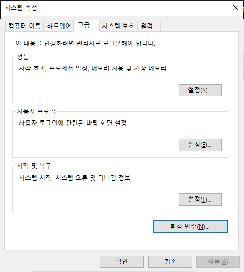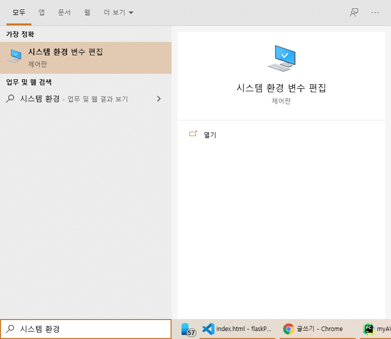 윈도우 환경에서는 이렇게 "시스템 환경" 혹은 "환경 변수"를 입력하면 제어판으로 연결되는 바로가기가 나타난다.