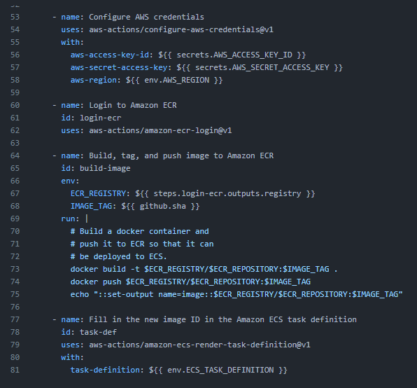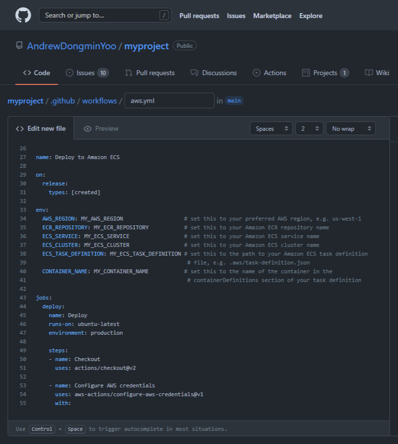 이런 템플릿을 제공해 줍니다. on: 부분은 어떠한 액션을 했을 때 이 프로세스들이 작동할 것인지를, env는 AWS 사용자 정보 등 원하는 기능을 수행하기 위한 환경 셋팅을, jobs는 그 작업 내용을 말합니다. 이 정도만 아셔도 큰 무리는 없구요.