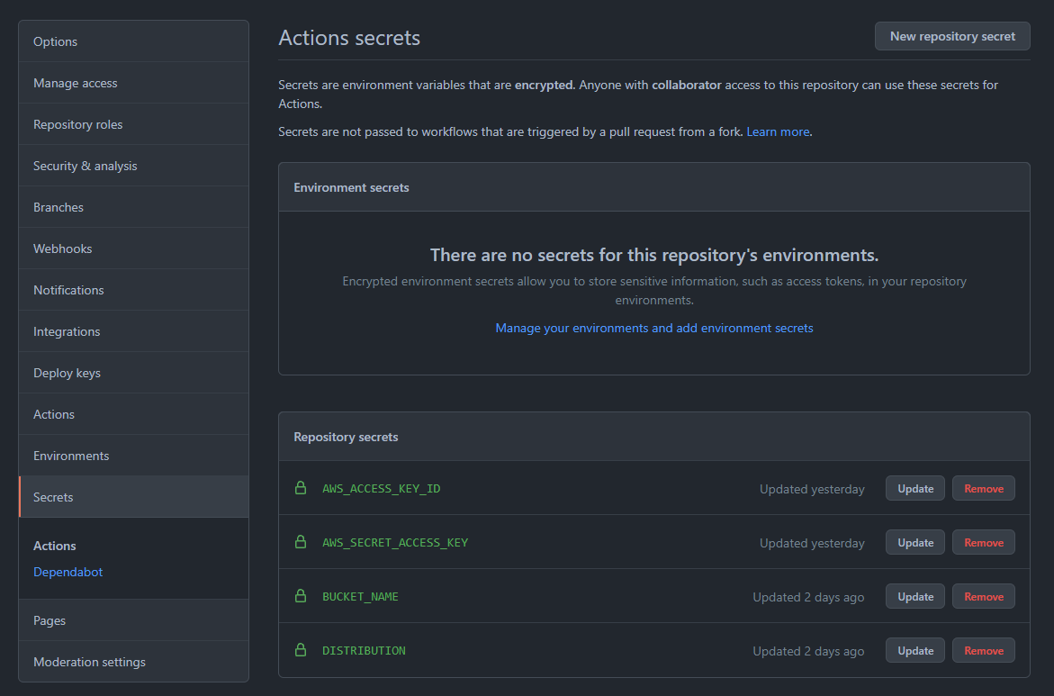 - AWS_SECRET_ACCESS_KEY - IAM에서 CloudFrontsFullAccess를 허용한 비밀 액세스 키