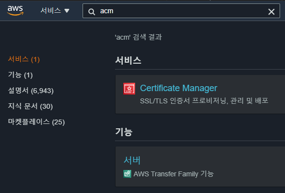 8. 이번엔 AWS의 ACM(인증서 관리자)으로 갑니다. 검색창에 ACM 또는 Certificate Manager를 입력해 접속합니다.