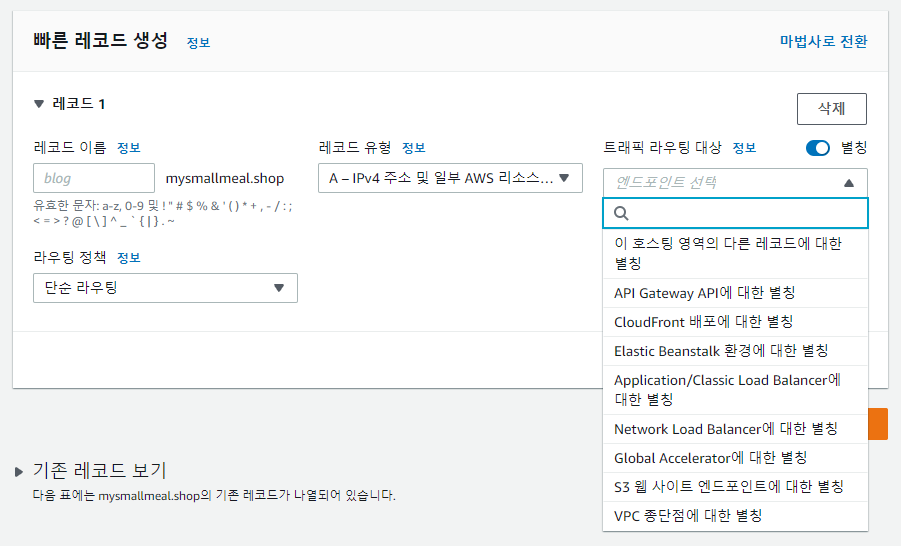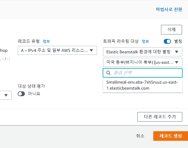 24. 아무것도 입력하지 않은 상태 (A 레코드 유형 그대로) 에서 오른쪽의 별칭 토글을 켜줍니다. Elastic Beanstalk를 클릭합니다.