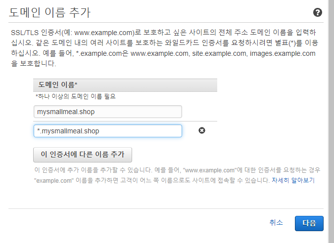 11. 도메인 이름에 만든 도메인 + *.을 넣은 도메인 두개를 입력해줍니다.