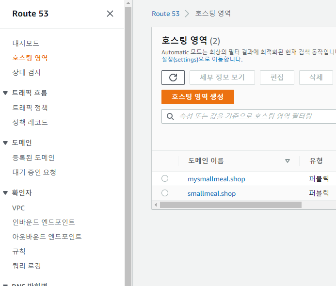 2. 왼쪽 네비게이션 탭에 따라 대시보드 아래의 호스팅영역에 들어가 주세요!