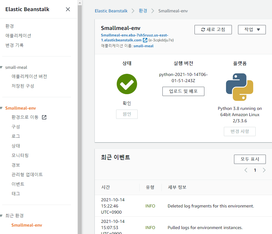 | [AWS] AWS ElasticBeanstalk(EB)으로 파이썬 플라스크 사이트 배포하기 (2) | 2021.10.14 |