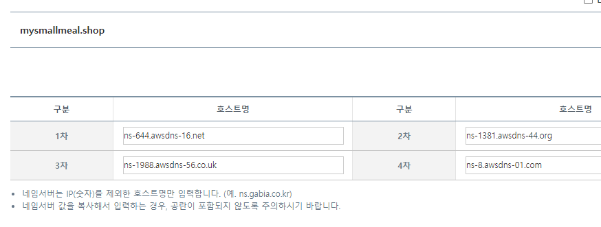 7. 1차~4차 네임서버의 값을 모두 위의 Route53에서 복사해 하나씩 붙여줍니다. 이제 가비아에서 샀지만 AWS가 관리하는 도메인이 됩니다.