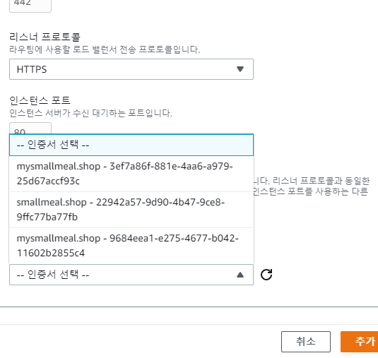 21. 인증서 선택을 클릭해서 등록하려던 도메인에 붙은 인증서를 클릭해 추가합니다. 저장합니다.