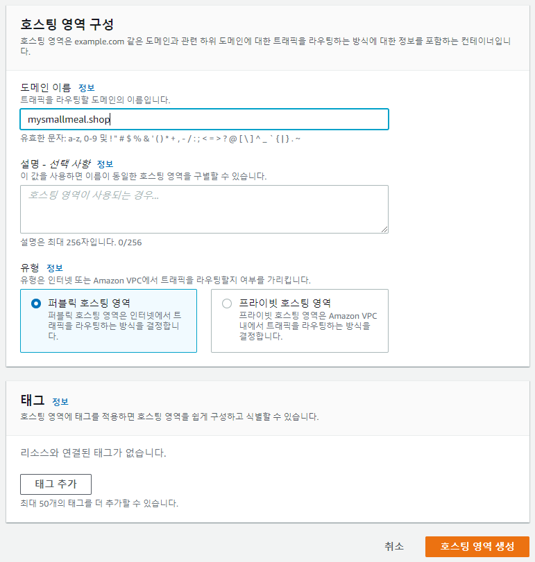 3. 호스팅 영역 생성(주황색 버튼!)을 클릭하고, 가비아 혹은 네임칩 등에서 받은 도메인을 입력해줍니다.