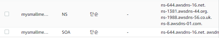 4. 따로 건드릴 것 없이 호스팅 영역 생성을 마무리해줍니다. 클릭해서 들어가보면 다음과 같은 값이 보이실 것입니다.
