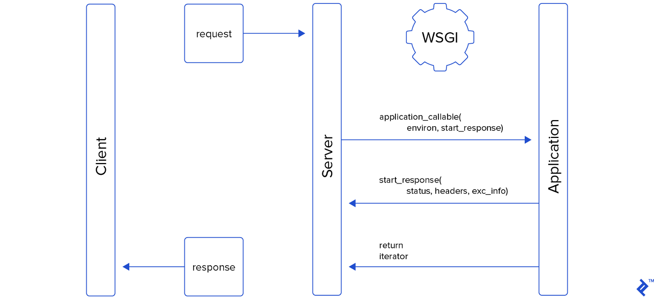 새로운 프로그래밍 언어를 배우거나 아예 코딩을 처음 배울 때, 개발자는 그것을 세상에 내놓을 방법을 당연스레 알고 싶어 합니다. 이렇게 폭발적으로 증가하고 있는 월드-와이드-웹이 그 대상이 되는 것은 당연한 수순일 것입니다. CGI 는 서버 요청 시마다 새로운 프로세스를 생성해야 해 메모리와 CPU를 심하게 낭비했기 때문에 실용적이지 못했고, 개발자들은 대안을 찾아 헤맸습니다. 2003년, Phillip J. Eby는 PEP-0333 , Python 웹 서버 게이트웨이 인터페이스(WSGI)를 제안했습니다 . Python 응용 프로그램과 웹 서버 간에 높은 수준의 범용 인터페이스를 제공하는 아이디어였습니다.