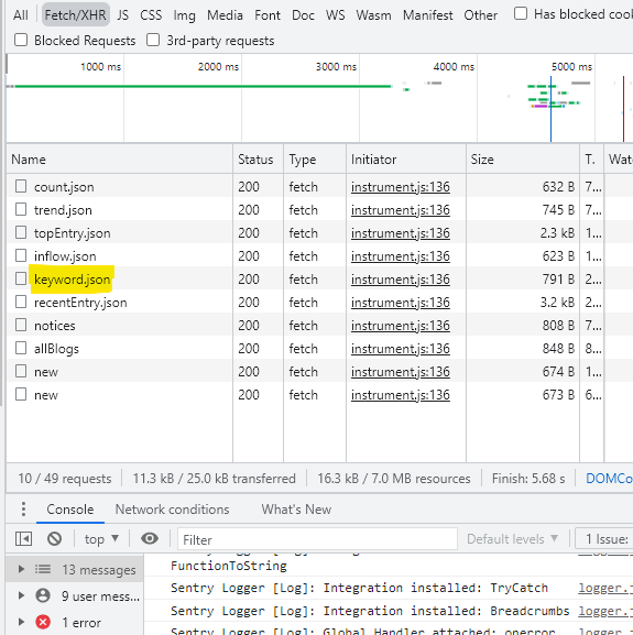 요 키워드라는 json 파일이 우리의 타겟입니다! 요 놈을 한번 들여다 볼거예요. 클릭해주세요.
