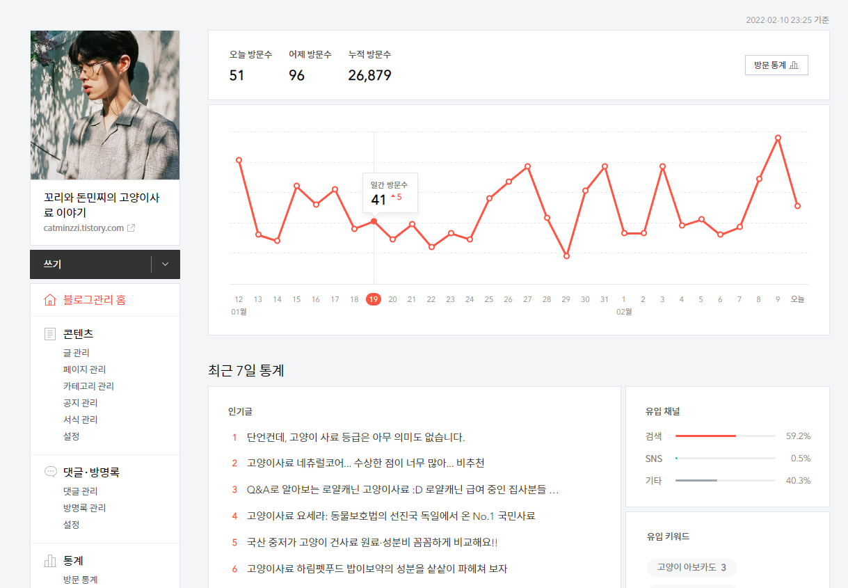 처음 블로그를 만들어 1년간 열심히 글을 썼던 고양이사료 블로그입니다. 매일매일 많은 분들이 검색을 통해서 들어와주시고 계시네요! 좀 더 본격적으로 키워드 트렌드에 맞춰 쓰는 분들이 보시기엔 너무 적은 숫자일 수도 있겠네요 ㅎㅎㅎ