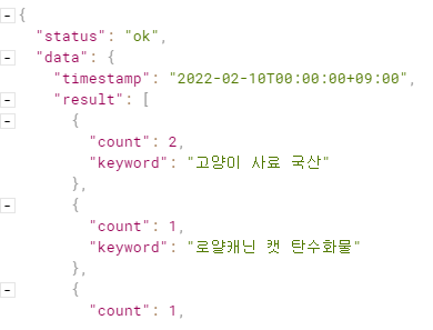 그러면 이런 데이터가 obj에 담길 거예요. 그러면 obj의 data 안에, result 안에 있는 단어들 중에서 keyword에 해당하는 단어를 count 번만큼 반복해서 저장하면 되겠네요? (알잘깔딱센 알쥬?)