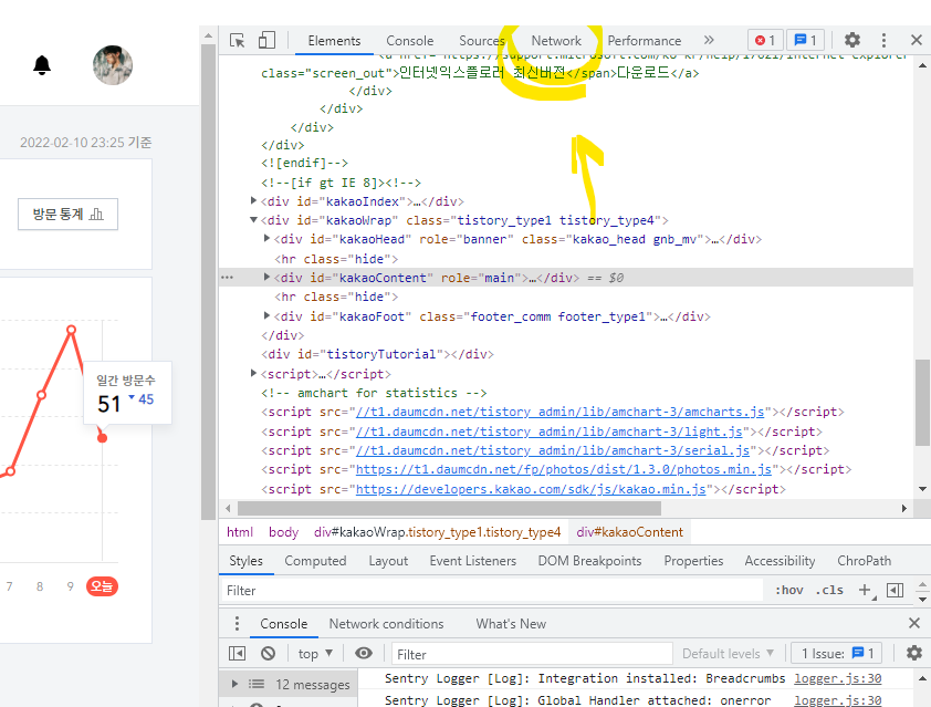 이 화면에서 그대로 F11 키를 눌러 개발자 도구로 들어가봅시다. Ctrl + Shift + C 키를 눌러도 좋아요!