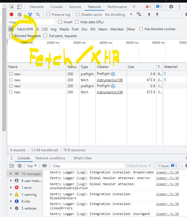 여기서 Fetch / XHR 을 눌러주세요. 조금 복잡하죠? 어려운건 금방 끝납니다. 그리고 페이지를 새로고침해주세요!