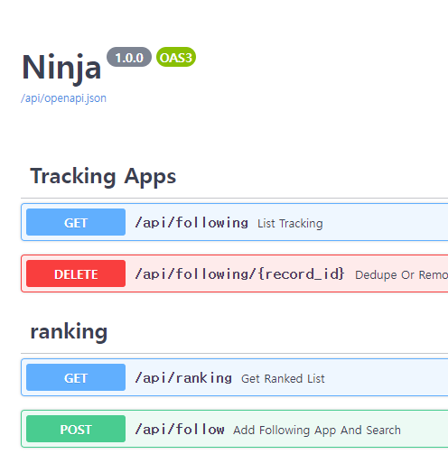 Django Ninja는 Django 및 Python 3.6+ 타입 힌트를 사용하여 API를 빌드하기 위한 웹 프레임워크입니다.