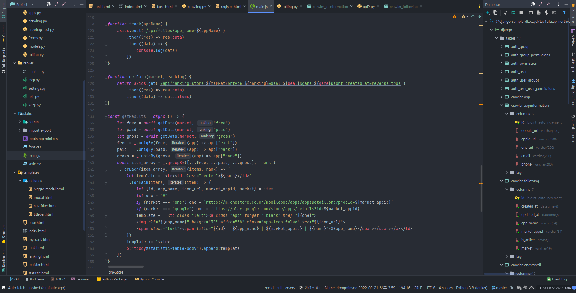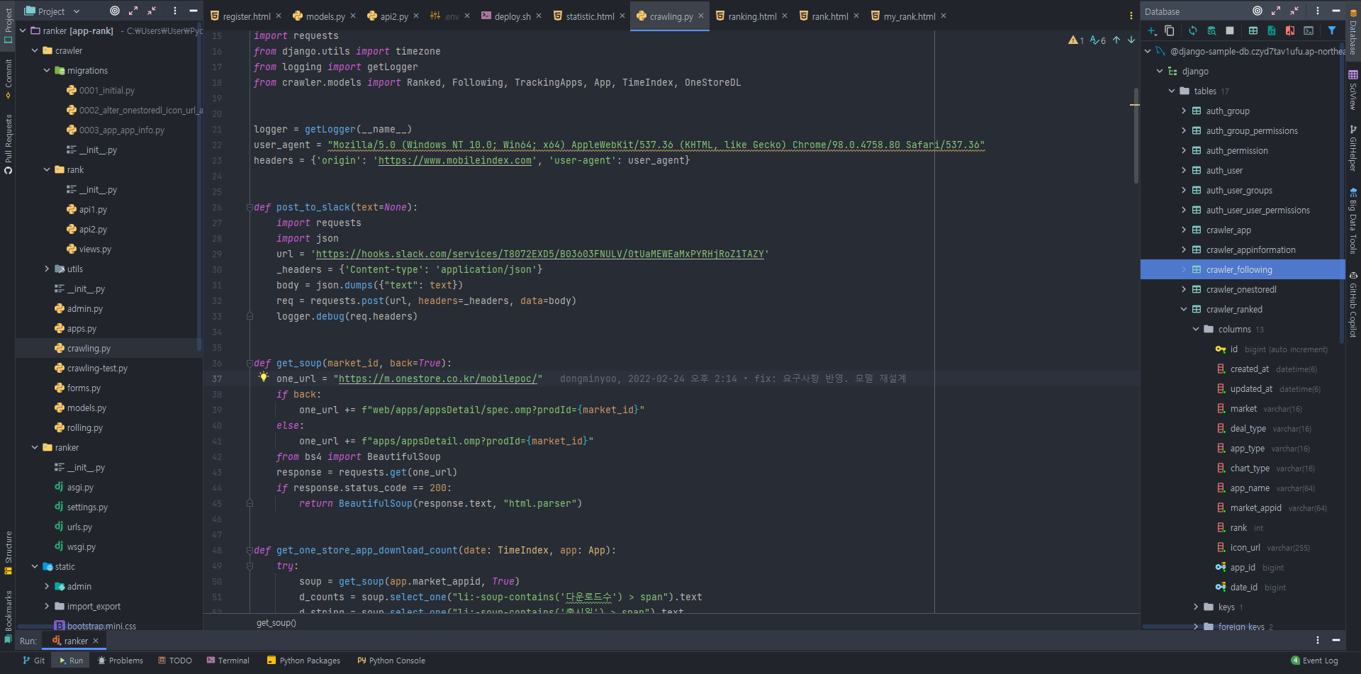 스프링 프로젝트를 할 때 깨달았던 것이지만, 스케줄링(크론) 작업에 셀레니움 같은 복잡하고 무거운 스크래퍼를 두는 것은 꽤나 복잡한 문제를 낳는다. 이번에는 requests로 JSON 혹은 HTML을 받아와 HTML의 경우에만 BeautifulSoup으로 파싱하는 코드를 작성했다. 매시각마다 랭킹을 기록하고, 하루에 한번 그 랭킹들 중 최고 순위를 기록하는 로직을 작성했고, 하루에 한번 내부 데이터베이스로부터 광고 중인 어플리케이션을 불러오는 것까지 구현했다. crontab을 쓰는 프로젝트에서 EB를 사용하면 거북하게 동작한다고 해서(안해봐서 확신은 못함) EC2에 배포했다.